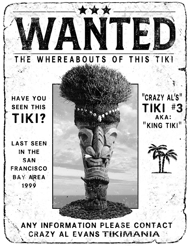 ![]() HAVE YOU SEEN THIS TIKI!?! Lost to the cobwebs of the mind, A fine person ran the LA Marathon and then pick up the King for it's trip to it's new home in N. California. I always have wanted to know where The King ended up! ![]() Last seen in a Silicon Valley office complex or possibly San Francisco 1999 -2001? *email al@tikimania.com KING TIKI LIVES "CrazyAL Tiki #3 - 10th Anniversary Mug 2006"