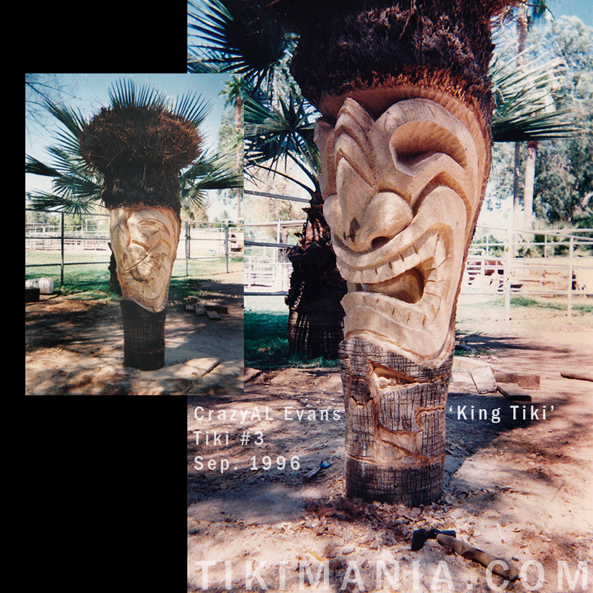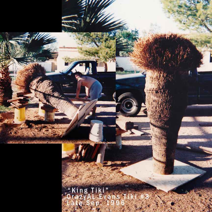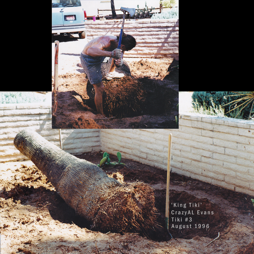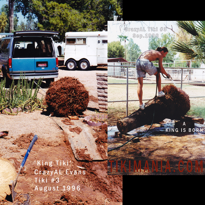 carved in the Early Fall of 1996 was a commission brought forth by the synergy of 1995's "Tiki Revivalists." "King Tiki" is a commission of sorts by the La Luz de Jesus Gallery, Hollywood CA. CrazyAL had a blank slate to create a new piece!! He thought to himself, "why not the King of all Tikis!" with a Crown, a Scepter, and Conquered Subject. This third tiki would use the design elements CrazyAL had developed over the last 5 years and his new 'Bone Productions' Products. These would be elements such as humanoid fingers, toes, tongue and hollow geometric eyes and 'Beachcombed' found objects. ![]() CrazyAL had his first Commission for large tikis!! and a tree gave itself up at just the right time. And! He could salvage a Root Ball! Days after just finishing his first two tikis, CrazyAL received a phone call (maybe even an email!?!) from Otto von Stroheim who was curating one of the first large 'Tiki Art' shows of the new revival scene. CrazyAL the fledgling Tiki Artist knew he had a giant 'root ball' back in AZ in his parents' front yard... Off to AZ he went in late September to get his third tiki done in time for the October 4th show!! ![]() How cool to crave the another "Art Piece' tiki in the front yard of Scottsdale AZ that had many a GI Joe Jeep track in it. CrazyAL and his dad had just removed this dying Palm. ![]() CrazyAL's Mom handed the reigns over for hours of more washing! ![]() "Greco-Roman" Forklift via High School Bud! ![]() ![]() Without Further Ado Conch Shell Blow Please!! Tiki #3! King Tiki!! 'Tiki with Sprinkler'