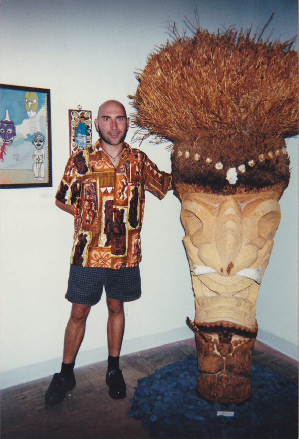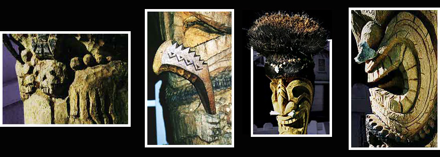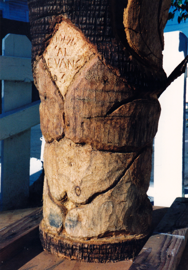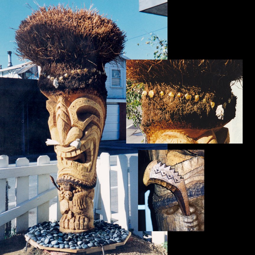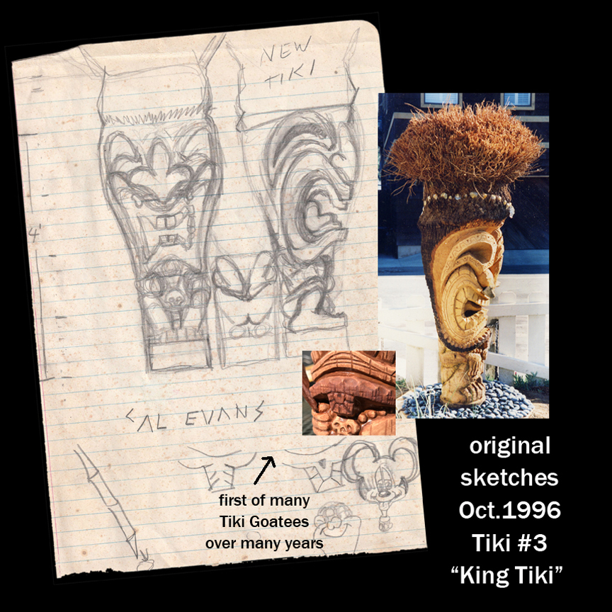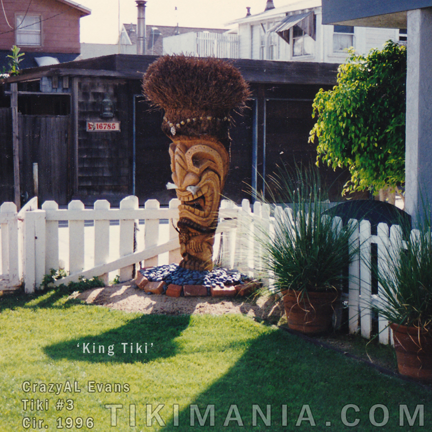carved in the Early Fall of 1996 was a commission brought forth by the synergy of 1995's "Tiki Revivalists." "King Tiki" is a commission of sorts by the La Luz de Jesus Gallery, Hollywood CA. CrazyAL had a blank slate to create a new piece!! He thought to himself, "why not the King of all Tikis!" with a Crown, a Scepter, and Conquered Subject. This third tiki would use the design elements CrazyAL had developed over the last 5 years and his new 'Bone Productions' Products. These would be elements such as humanoid fingers, toes, tongue and hollow geometric eyes and 'Beachcombed' found objects. ![]() CrazyAL had his first Commission for large tikis!! and a tree gave itself up at just the right time. And! He could salvage a Root Ball! Days after just finishing his first two tikis, CrazyAL received a phone call (maybe even an email!?!) from Otto von Stroheim who was curating one of the first large 'Tiki Art' shows of the new revival scene. CrazyAL the fledgling Tiki Artist knew he had a giant 'root ball' back in AZ in his parents' front yard... Off to AZ he went in late September to get his third tiki done in time for the October 4th show!! ![]() How cool to crave the another "Art Piece' tiki in the front yard of Scottsdale AZ that had many a GI Joe Jeep track in it. CrazyAL and his dad had just removed this dying Palm. ![]() CrazyAL's Mom handed the reigns over for hours of more washing! ![]() "Greco-Roman" Forklift via High School Bud! ![]() ![]() Without Further Ado Conch Shell Blow Please!! Tiki #3! King Tiki!! 'Tiki with Sprinkler'