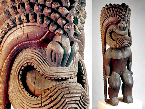 "Tribute" Tiki #300 is a sculpture that celebrates the Hawaiian God of Gods, 'Ku' with three ancestral Marquesan figures standing guard over each centuria in the Crazy Anthology.